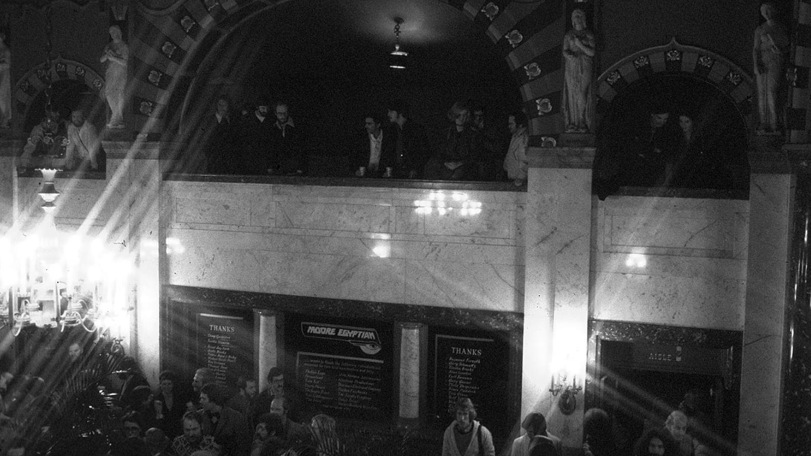 Guests look down from the first balcony in the Moore Egyptian lobby